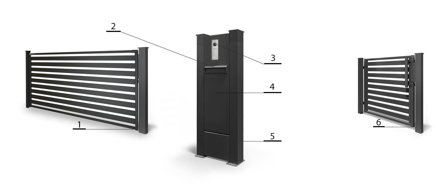 1. Zaunfeld, 2. Briefkasten, 3. Videosprechanlage (verfügbar in drei Farben: Braun, Silber, Gold), 4. Centerbox – das Verwaltungssystem ist im Zaun integriert und verbindet sich mit dem Haus, 5. Steuerzentrale mit Versorgungselementen des Systems, 6. Pforte mit e-öffner.