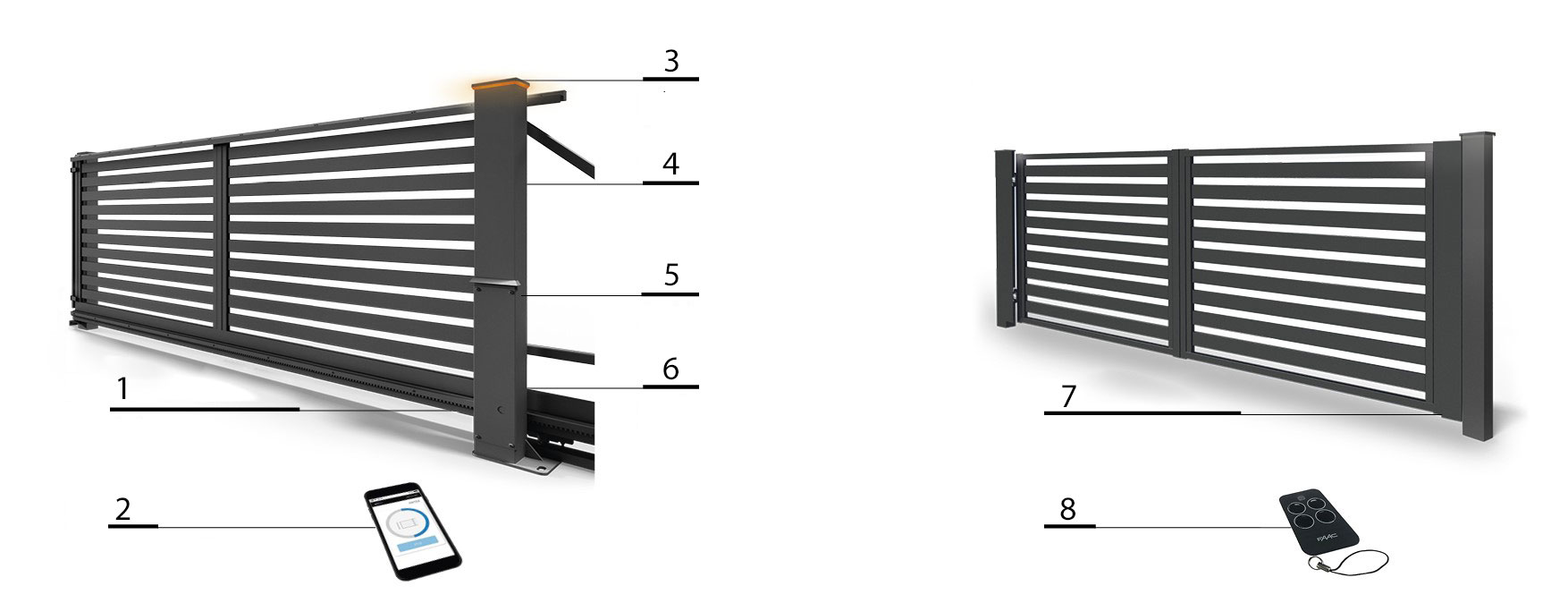 1. Schiebetor TOP mit Schiene, 2. App – mobile Kontrolle, 3. LED Lampa (die Farben von Weiß auf Orange wechselt), 4. Antriebsäule (integriert mit dem Antrieb und der Automatik des Schiebetors, verhinder das Eindringen von Feuchtigkeit und minimiert die Anzahl der sichtbaren Elemente im Zaun), 5. Lichtschranke – Er erleichtert die Nutzung des Tores und sorgt für die Sicherheit, 6. Antrieb – Steuerung intelligent in der Säule integriert, 7. Drehflügeltor, 8. Handsender.